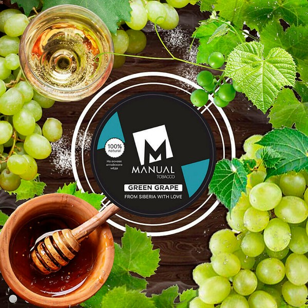 Настоящий вкус мускатного зелёного винограда является фаворитом всех времён, когда речь заходит о кальяне. Он соединяет в себе и мягкую сладость, при этом отсутствие приторности, и легкие нотки терпкости, и освежающее послевкусие. Табак для кальяна Manual (Мануал) - новый продукт на рынке. Производится на основе табачного листа Berley, немецкого глицерина и натуральных ароматизаторов. Компания использует табачное сырье только высшего качества. Ароматизаторы, которые используются в продукте, в основном из Америки, Европы и Малайзии. Еще один очень важный компонент каждой смеси – это натуральный алтайский цветочный мёд. Табак для кальяна не содержит жидкого никотина, сиропов, и красителей вредных для здоровья.