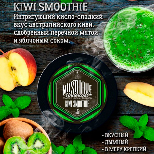 В основу базы табака Must Have легли отборные листья табака Бёрли специально подобранные по необходимым параметрам в семи странах мира (Бразилия, США, Малави, Аргентина, Бангладеш, Испания, Италия).Табак упакован в стильно оформленную герметичную банку с дополнительным внутренним контроллером, создающим вакуумное пространство в процессе «дыхания» табака, что, несомненно, позволяет на 100% сохранить вкус и аромат композиции очень продолжительное время. Kiwi Smoothie - Интригующий кисло-сладкий вкус австралийского киви, сдобренный перечной мятой и яблочным соком.